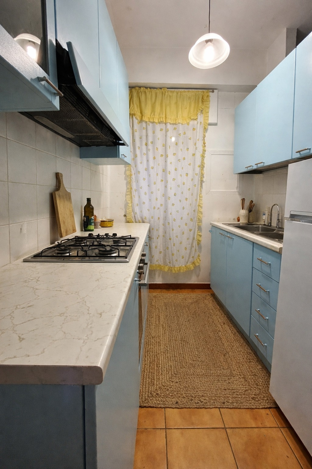 L’ingresso conduce alla zona cucina/pranzo, dalla quale si accede agli altri locali. La proprietà dispone di tre camere, di cui una con affaccio verso l’esterno, mentre le altre due – poste in prossimità della cucina – risultano prive di aperture dirette (cieche). Anche il bagno è interno e non finestrato.