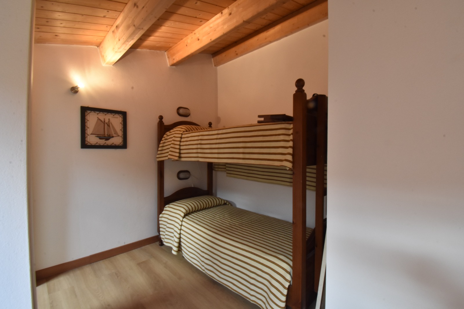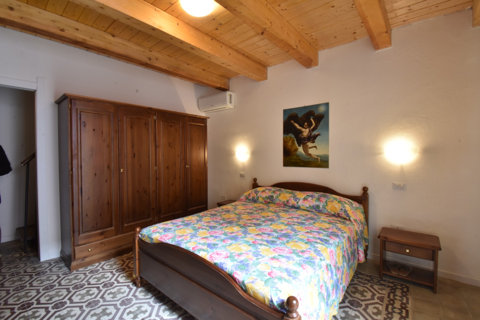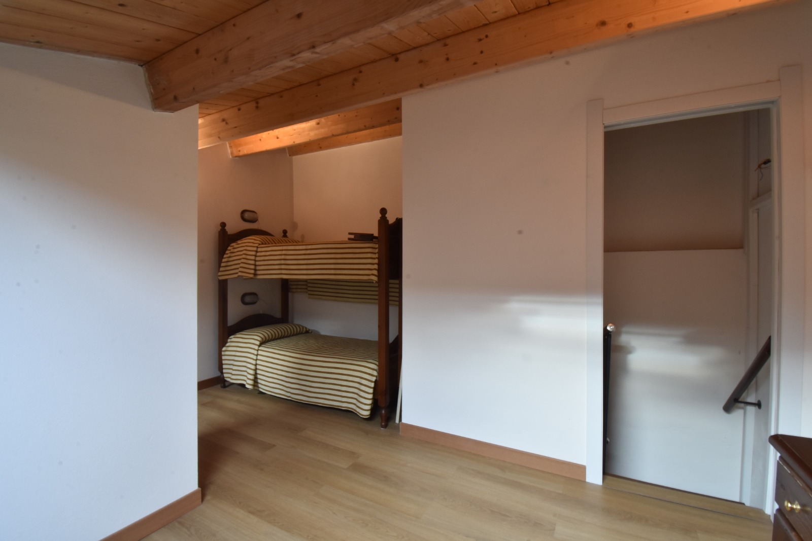 Gli ambienti sono accoglienti e luminosi, valorizzati da travi in legno a vista e finiture curate.